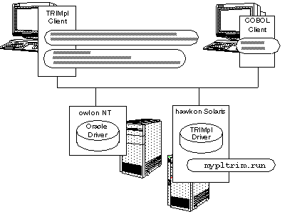 Now you can access TRIMpl application code (the RPC-- remote procedure call) from any machine on the network. Any programs you created with TRIMpl, including calculations, text manipulation, and access programs, for example, become transparently available to any other TRIMpl "client" on the same network.